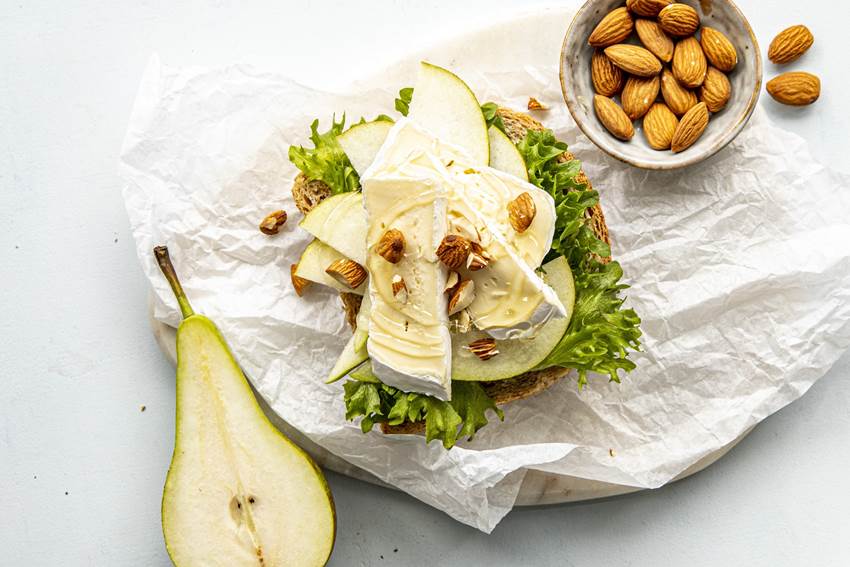 - Legg salat på brødskiven og fortsett med gode skiver moden brie.