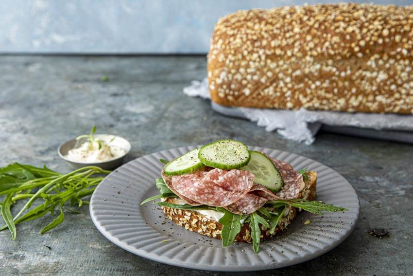 Visste du at Våre Groveste Havrebrød er bakt i form? Dette gir et saftig brød og god skorpe. Legg på noen skiver salami på brødet, så har du et enkelt og godt måltid!