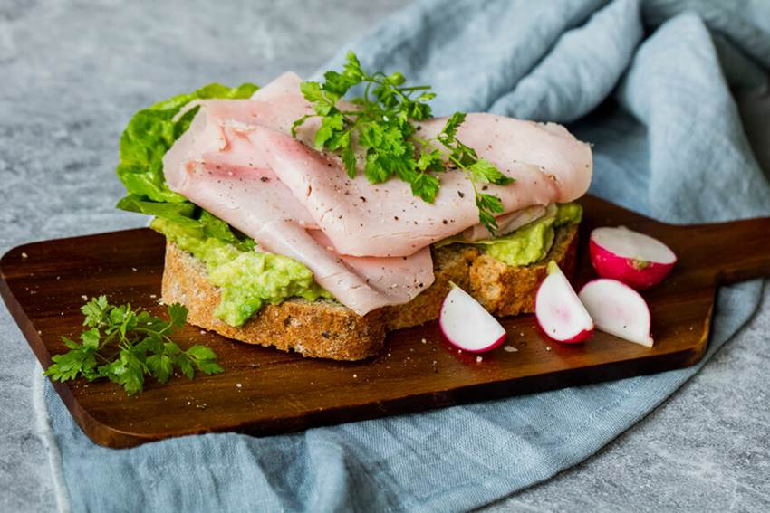 2. Smør avokadomosen på brødskiven og topp med god og mager skinke og masse urter.