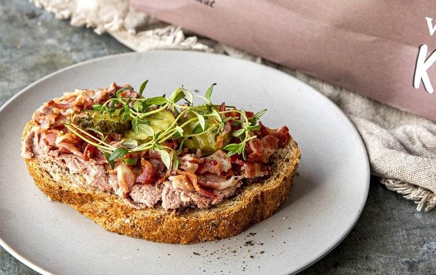 - Smør leverpostei på skiven og topp med sprøstekt bacon og syltet agurk.