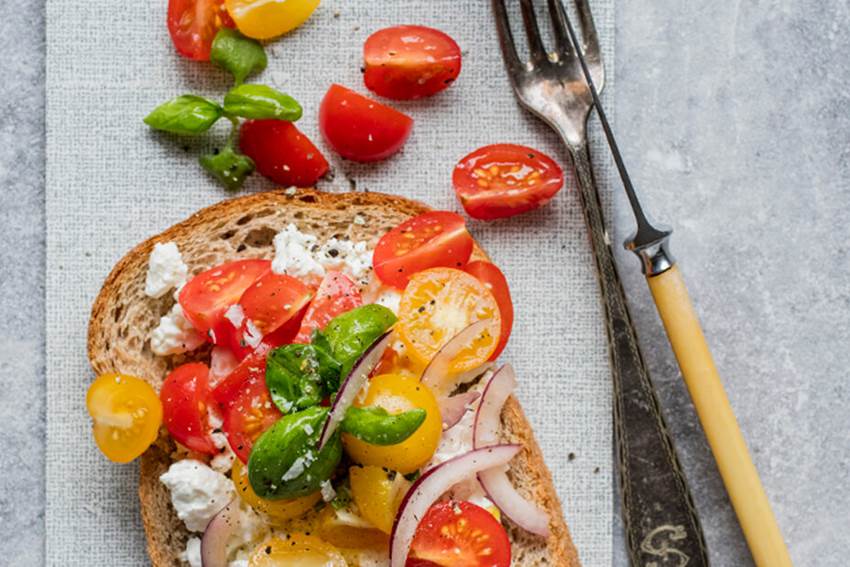 - Skjær en god brødskive. Bruk små søte tomater og del dem i skiver eller båter før du legger dem på brødskiven.