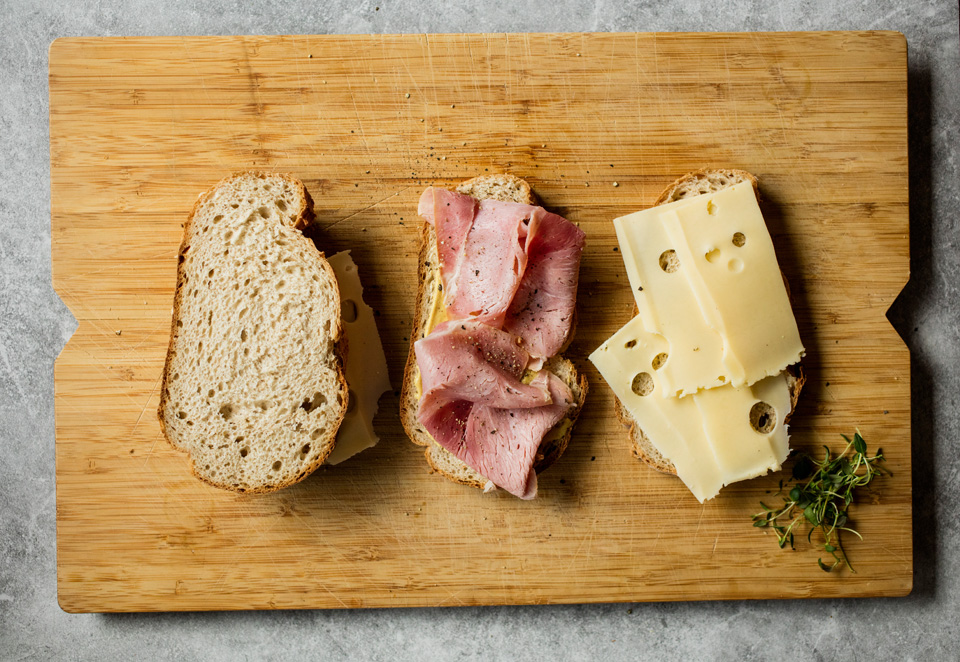 1. Legg et par osteskiver og skinke på halvparten av alle brødskivene.