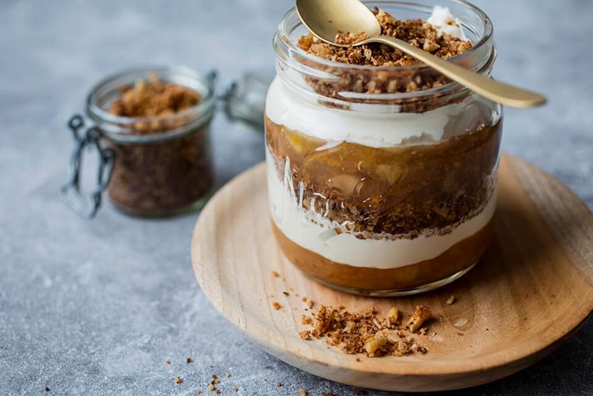 Legg blandingen lagvis på glass med krem og eplesyltetøy.
