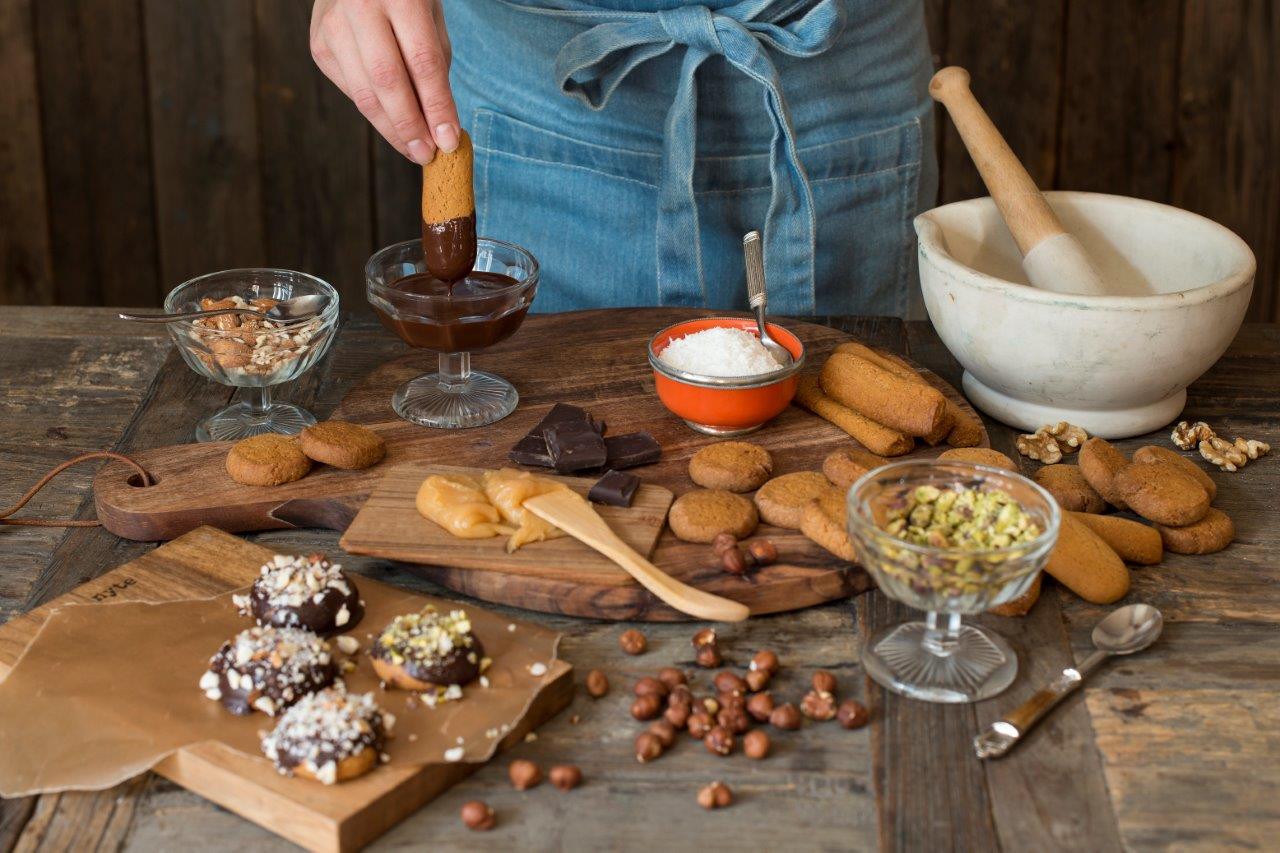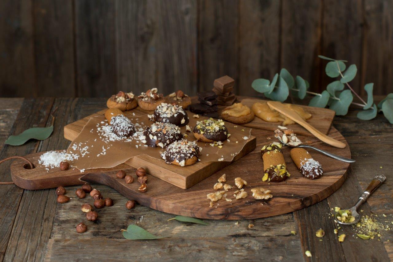 Når pepperkakene er avkjølt, dypp dem i sjokolade eller smør på karamell.
