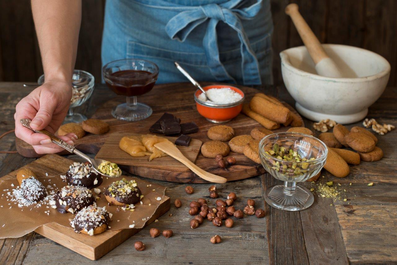 2. Rulles i kokos, hakkede mandler, pistasj, hassselnøtter eller valnøtter.