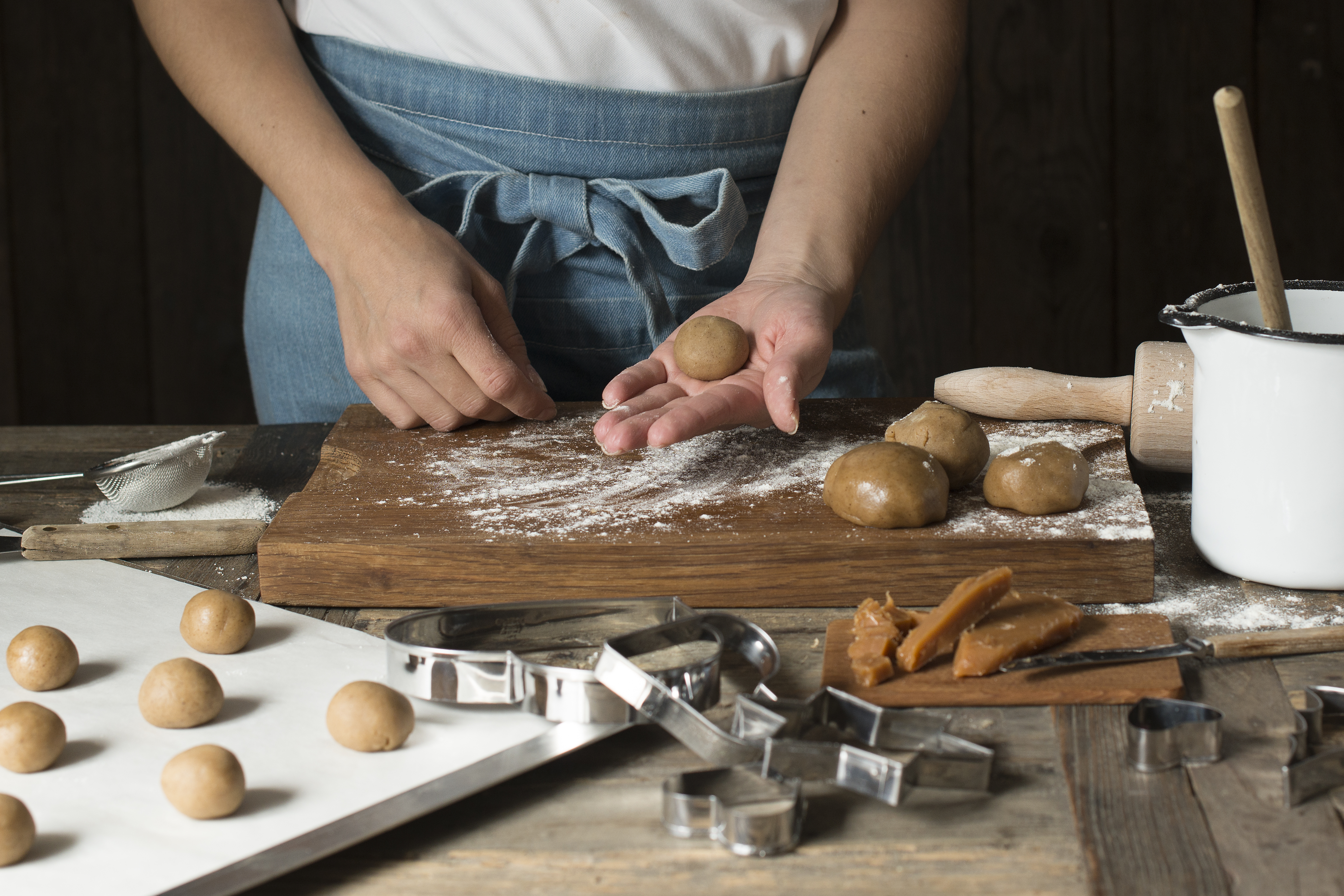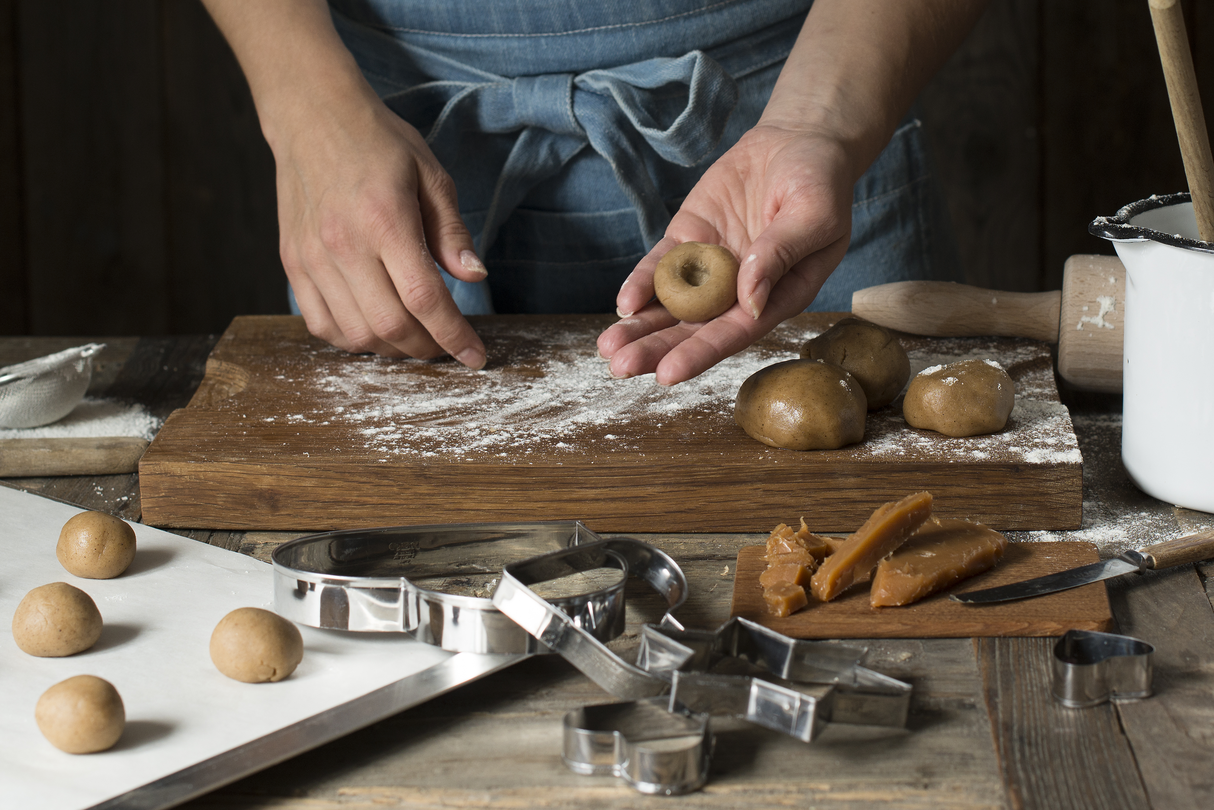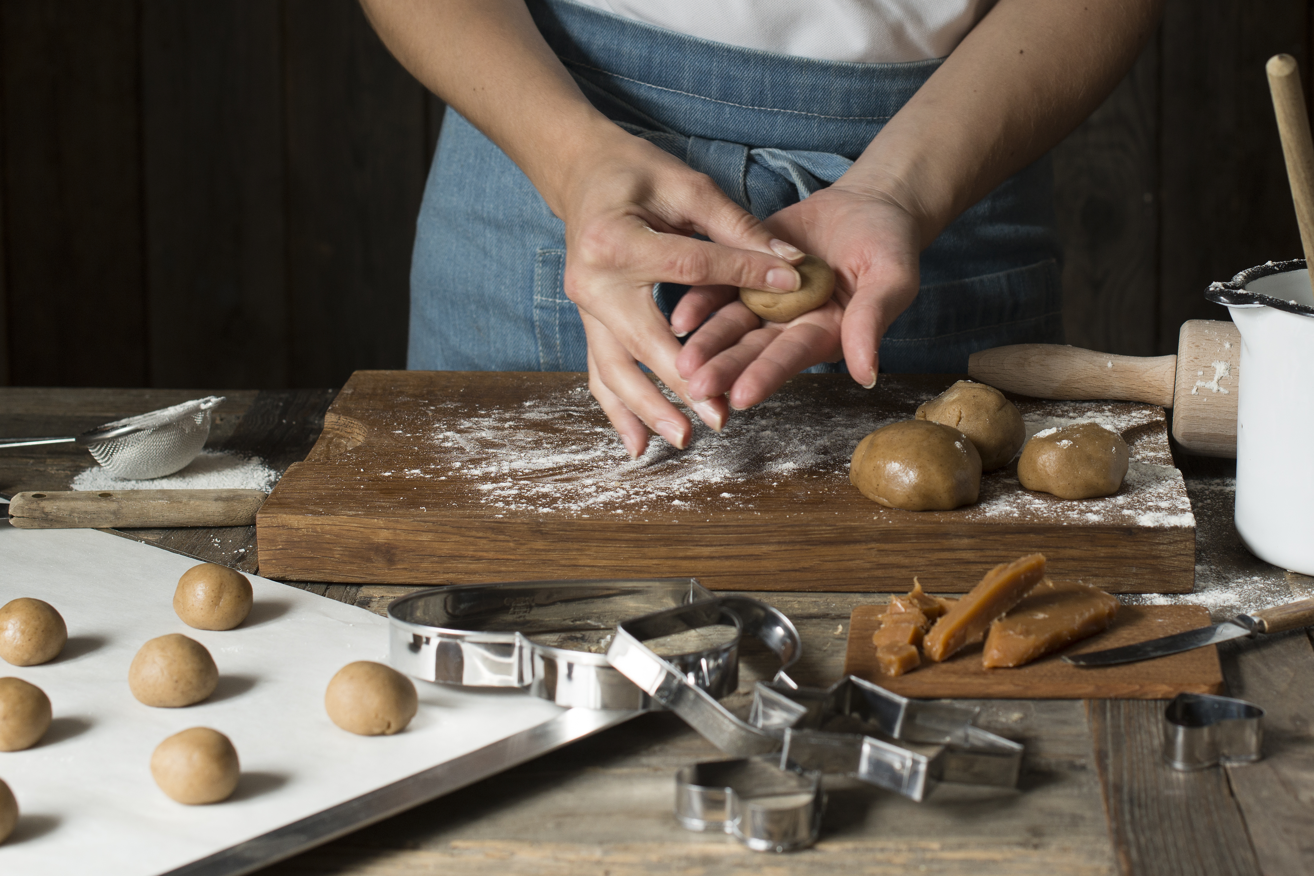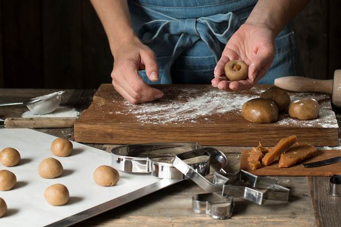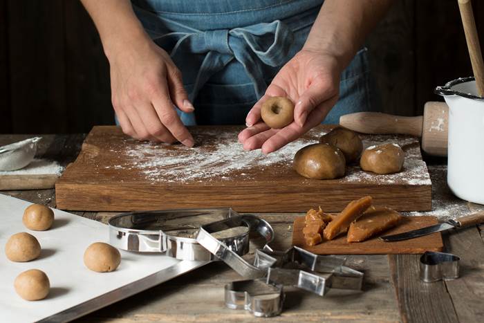 Form pepperkakedeig til kuler, lag så ett lite hull.