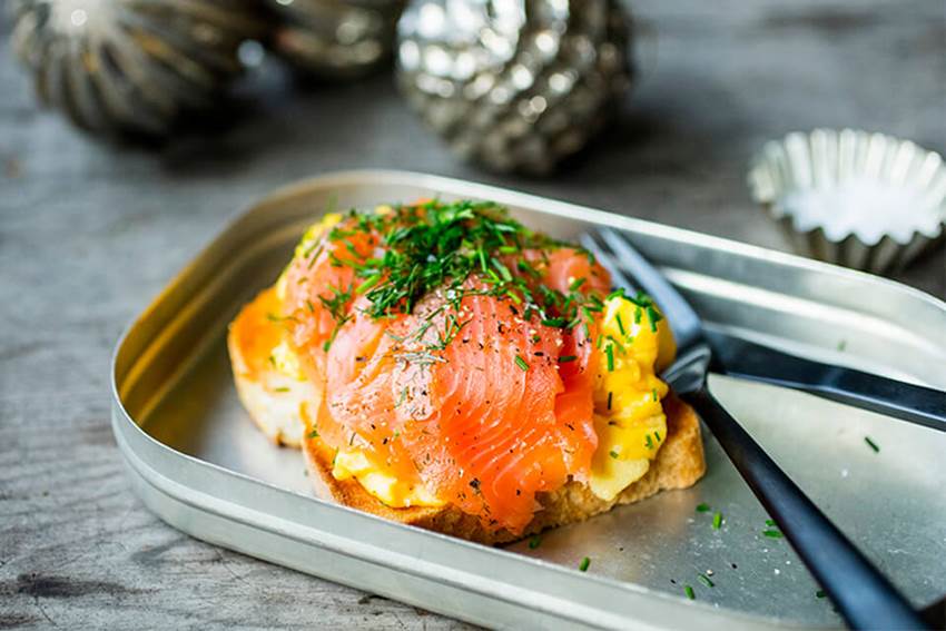 Julebrødskive med egg og gravet laks
