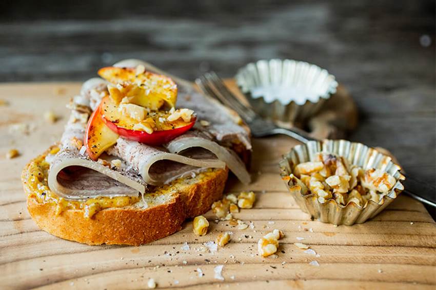 Smør skiven med sennep, og legg på skiver med sylte. Stek båter av eple i stekepannen til de blir gylne på begge sider. Legges på toppen av skiven sammen med hakkede valnøtter.