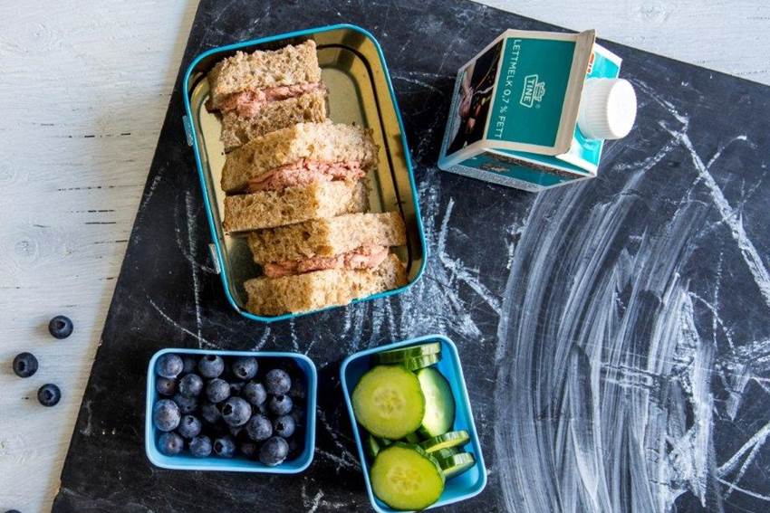 Skjær doble skiver med leverpostei i fire deler. Agurk og blåbær smaker godt i denne matpakken.