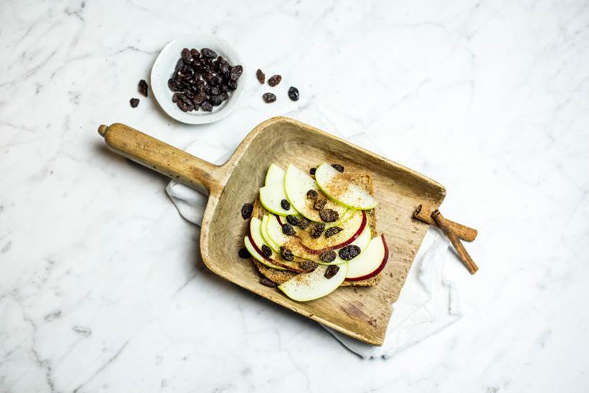 2. Legg epleskivene på en skive Skogbrød, topp med rosiner, og krydre med kanel.