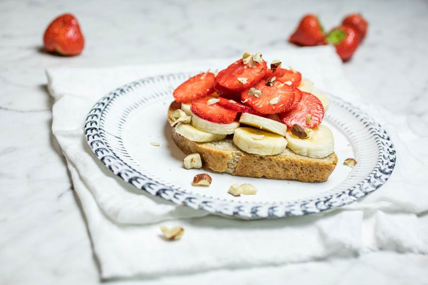 - Skjær skiver av banan og jordbær og legg på en skive Vårt Lokale Hverdags Grovt.